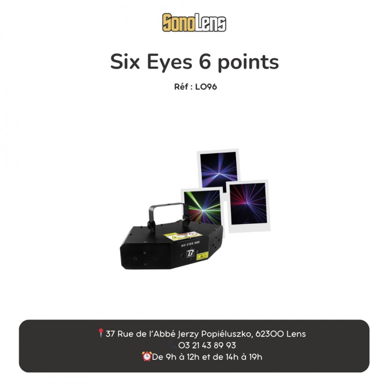 LASER à 6 ouvertures BoomToneDJ Six Eyes RGB, offrant une très large ouverture. Ce laser est équipé de 6 sources dont 2 vertes, 2 rouges et 2 bleues multifaisceaux avec effet rotatif !