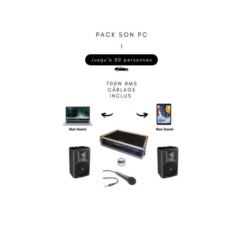 Location Pack Son PC 2 jusqu'à 80 personnes. 700W RMS. Prêt à l'emploi, avec câblage. Pack idéal pour vos fêtes : baptême, mariage, anniversaire, communion, célébration... 1 entrée pour PC, smartphone ou tablette. 1 lecteur CD, MP3 et USB. 1 micro sans fil inclus. Nous vous conseillons de prendre l'option pied pour poser les enceintes et l'option Ipad...
