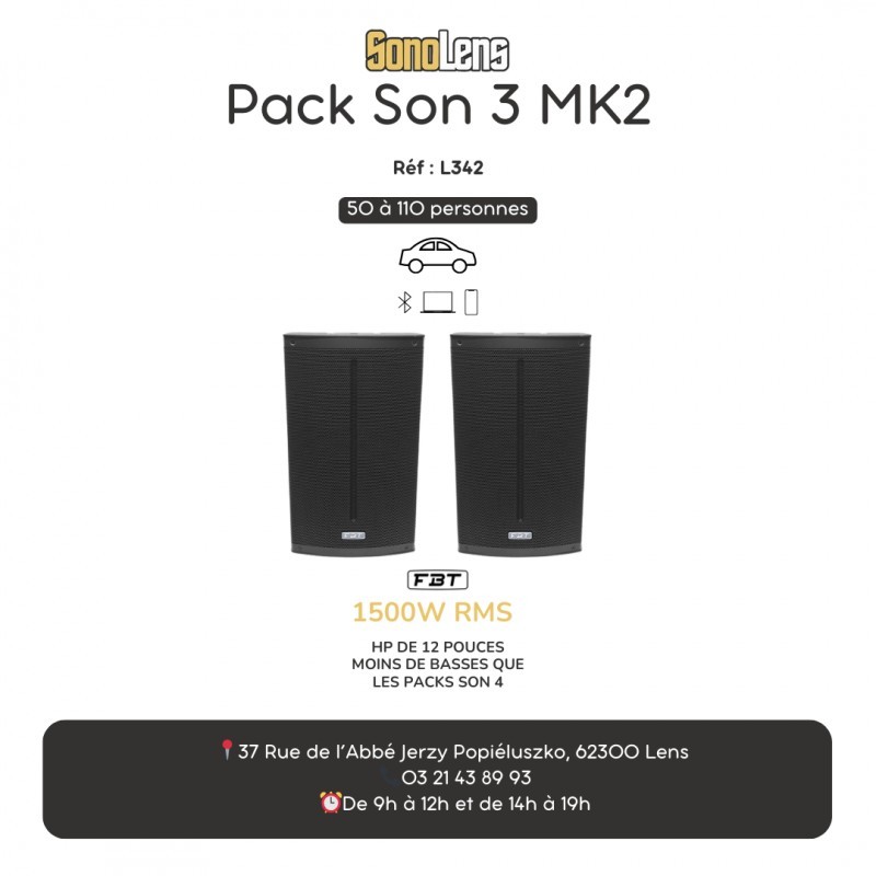 Location Pack Son 3 MK2 pour 50 à 110 personnes. 1500W RMS. Câblage inclus, prêt à l'emploi. Branchez directement PC ou téléphone dessus.