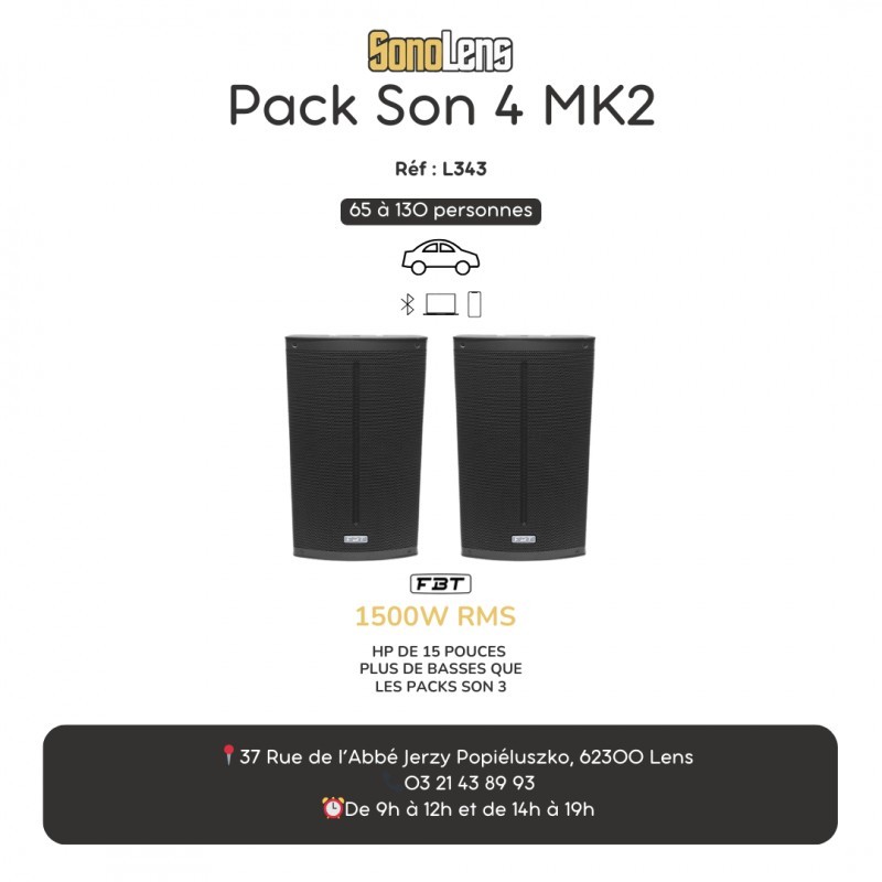 Location Pack Son 4 MK2 pour 65 à 130 personnes. 1500W RMS. Câblage inclus, prêt à l'emploi. Branchez directement PC ou téléphone dessus.