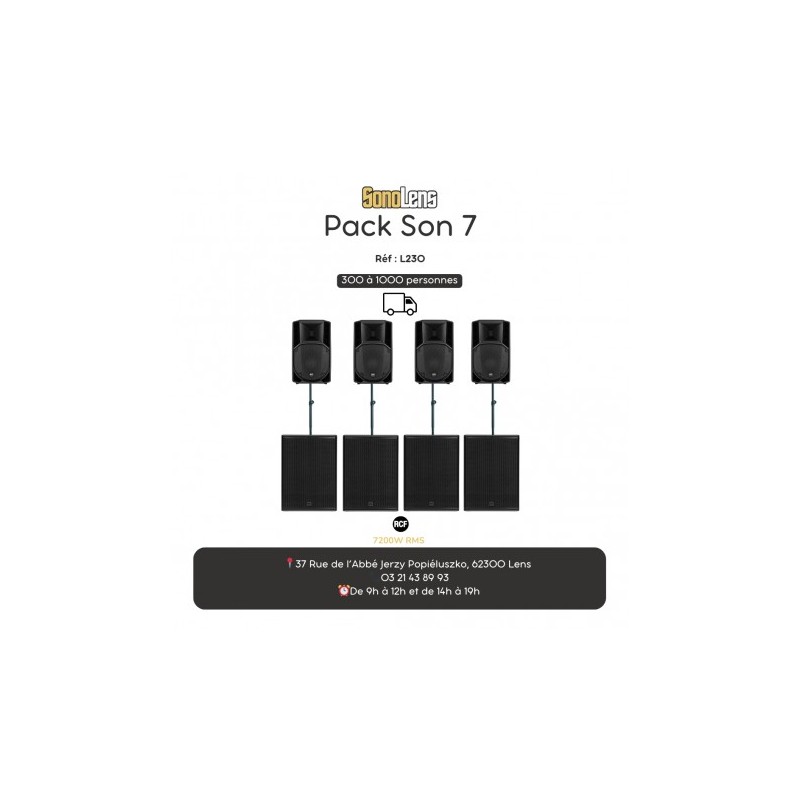 Location Pack Son 7 pour 300 à 1000 personnes. 7200W RMS. Câblage inclus, prêt à l'emploi. Branchez directement PC ou téléphone.