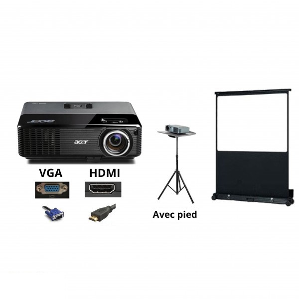 Location Vidéo-projecteur 3500 lumens connectiques Vidéo et PC + Ecran 2.28m x 3.05m. Câblages inclus, notice fournie. Connectique VGA + HDMI. Recul écran vidéo-projecteur entre 4 et 6 m Idéal pour vos événements professionnels ou privés : diffusion de films/vidéos/photos, karaoké, réunion, conférence. Nous vous conseillons de choisir l'option pied pour...