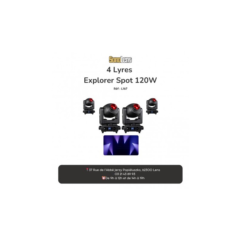 Location Pack 4 lyres Explorer Spot 120W. Livrées avec crochets de fixation. Tarif pour la paire.