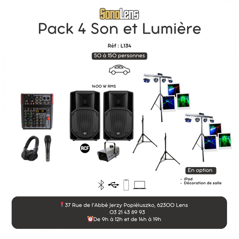 Location Sono Pack 4 son et lumière pour 50 à 150 personnes. Câblage inclus, notice fournie. Régie compatible PC (USB) et téléphone (mini-jack).