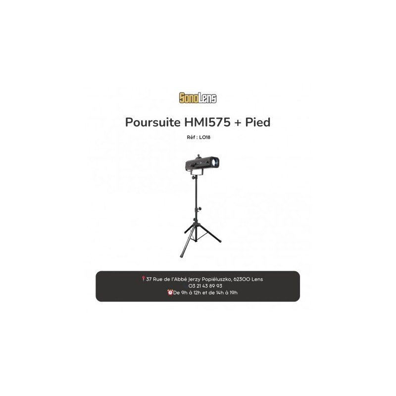 Poursuite 575w HMI + pied : équipée d'un changeur de couleur dichroïque. Fournie avec un pied. La poursuite est un poussant projecteur blanc utilisé pour éclairer un artiste et pourquoi pas un père noël...